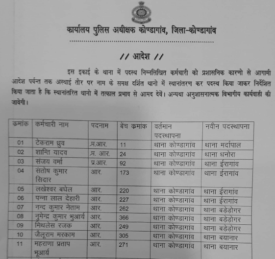 कोंडागांव : कोंडागांव जिले के पुलिस विभाग द्वारा लगभग 350 पुलिसकर्मियों का ट्रांसफर लिस्ट जारी किया गया है जिसमें 27 एएसआई का जिला अंतर्गत ट्रांसफर किया गया है वही दूसरी ओर 318 प्रधान आरक्षक और आरक्षक का भी स्थानांतरण किया गया है
